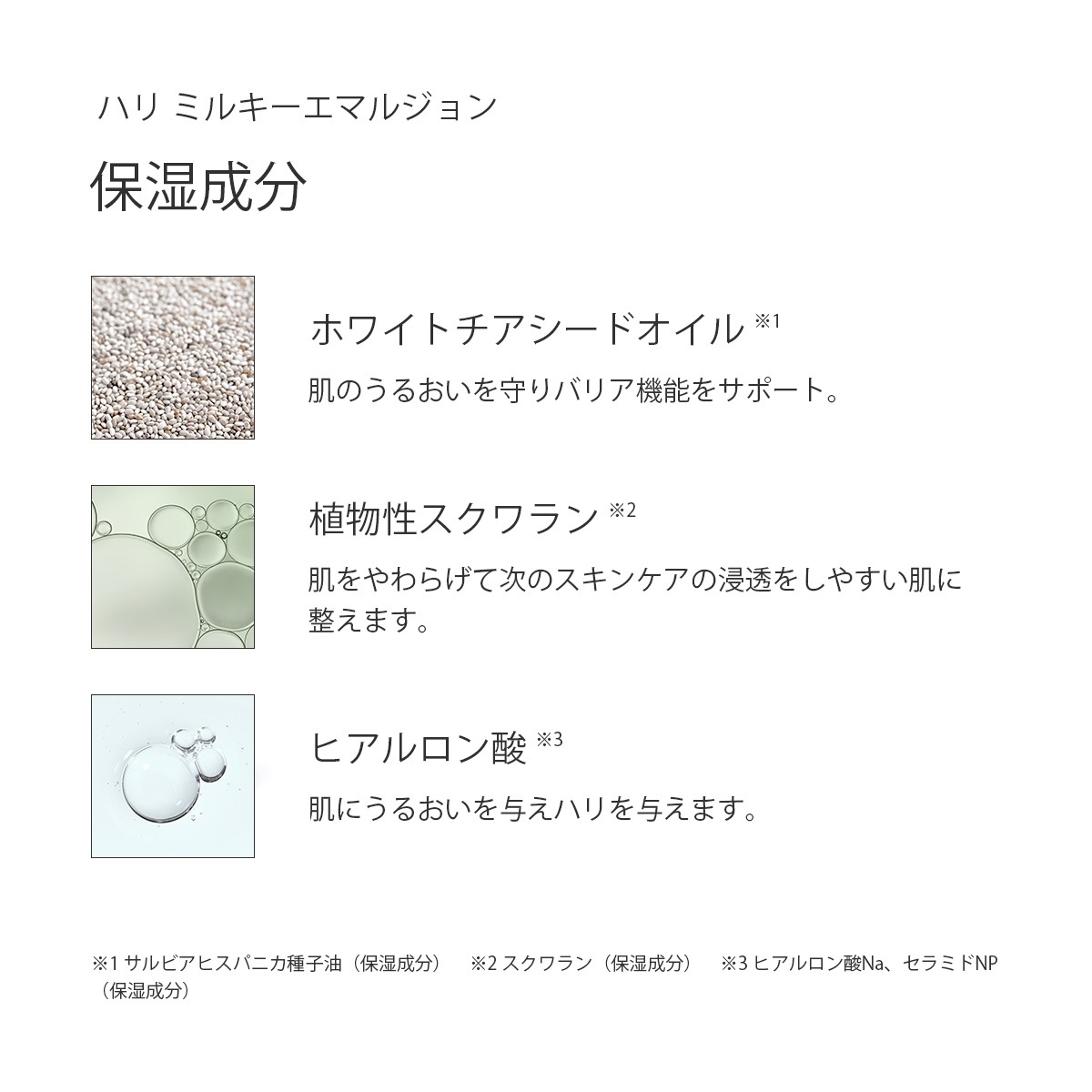 保湿成分:※1 サルビアヒスパニカ種子油、※2 スクワラン、※3ヒアルロン酸Na、セラミドNP