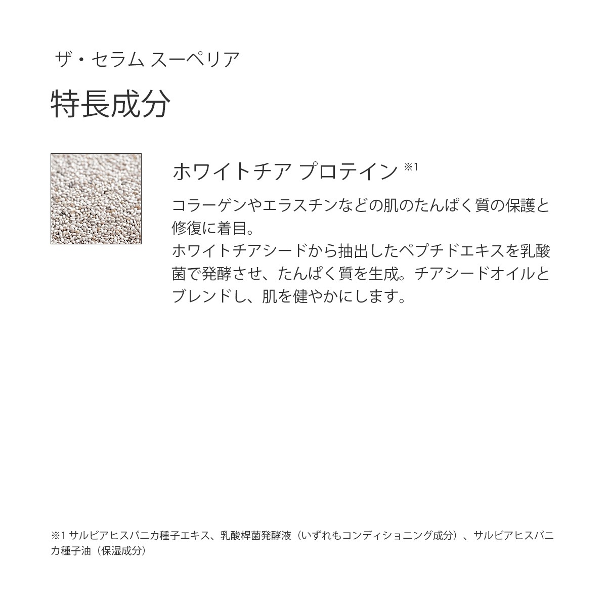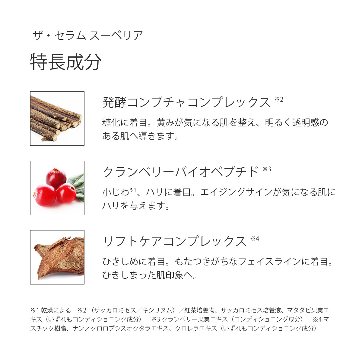 エイジングケア(※1)の「ザ・セラム スーペリア」は10の美肌サインの中でも特に肌の透明感、小じわ(※2)、ハリ、ひきしめ、色ムラに着目し、強化している美容液。若々しいハリがみなぎる透明感のある肌へ導きます。